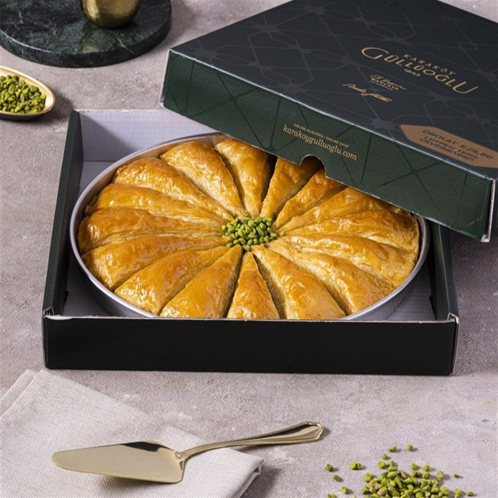 Palace Baklava with Pistachios (also known as Carrot Slice Baklava) is made from 30 layers of filo pastry, using more dough than other kinds of baklava. Inside it contains a generous amount of coarsely ground pistachios and higher amounts of butter with less sugar, offering a more distinct nutty flavor that's not too sweet.